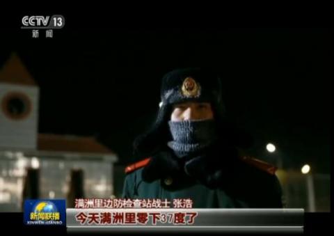 满洲里边防检查站战士张浩:今天满洲里零下37度了,挺冷的。过年了,也不能回去陪你们,希望你们别太想我。我在这都挺好的。