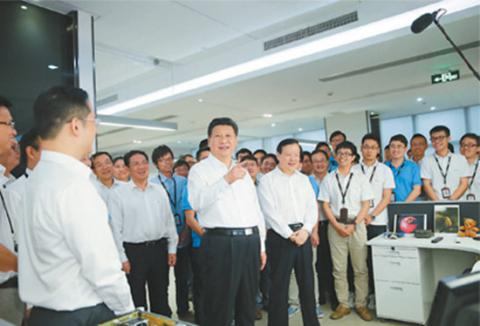 图为:2015年5月25日至27日,中共中央总书记、国家主席、中央军委主席习近平在浙江考察调研。这是5月26日下午,习近平在杭州海康威视数字技术股份有限公司研发中心勉励科技人员多出成果。
