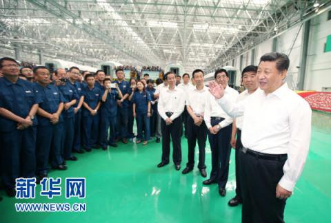 图为:2015年7月17日,习近平在中国中车长春轨道客车股份有限公司考察时同现场职工交流。