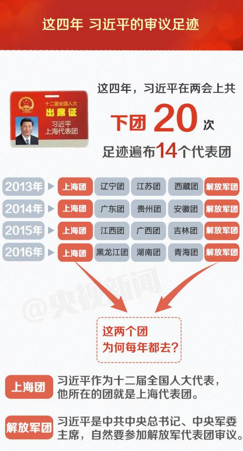 过去四年的两会,每到3月4日下午,习近平都会"如约"参加全国政协的一个联组会讨论。 3月5日下午,他会在自己所在的上海代表团参加审议。6日至10日之间,他会有针对性地选择3个省份代表团参加审议。两会后半程,他会出席解放军代表团全体会议。