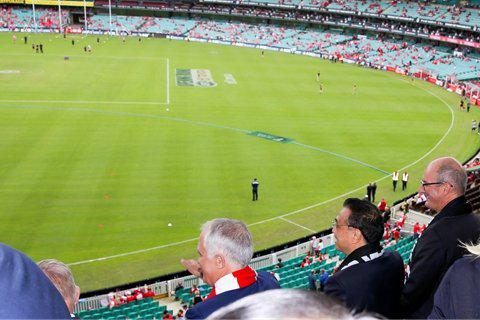 观看澳式足球比赛,在李克强总理此次出访行程中备受关注。在两天前的欢迎午宴上,特恩布尔和反对党领袖肖顿都向李总理推荐自己故乡的球队。而在25日下午的致辞中,特恩布尔再次表示,他非常高兴能在自己的故乡、悉尼天鹅队的主场,和李克强总理一起观看本赛季的首场比赛。"这显示出澳中两国的合作正在拓展到越来越广阔的领域,包括在体育人文领域的合作。"