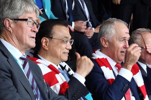 特恩布尔解释说,两国总理一人支持一队,看起来更加平衡。但当两位总理随后走上球场看台时,一位热情的天鹅队球迷从人群中向中国总理扔来一条红白相间的"天鹅队围巾"。