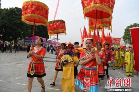 当日上午9点,来自云南、贵州、海南、广西四省区的壮族、布依族、水族、黎族、侗族、傣族、仫佬族、毛南族等八个少数民族33支队伍,数万名群众前来参加祭祀仪式。