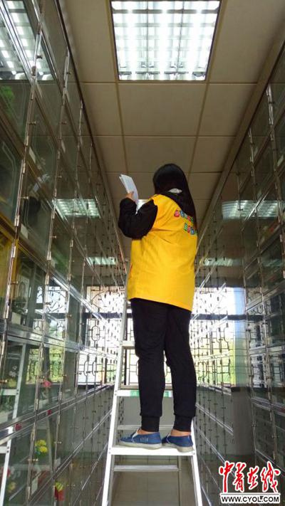 安排好志愿者的分工工作,王钰瑶来到她负责的铭恩楼。她所在的302室是新建的骨灰室,因此很多格子都是空的,她负责登记新入的或者调入的骨灰编号、死者姓名、家属姓名、入存日期与骨灰的具体位置。