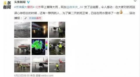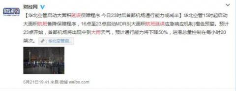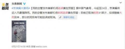 首都机场官方微博早在21日就发布消息提示,预计当天16时至20时会出现短时雷雨,23时后有雷阵雨,累积降水量中到大雨。今天首都机场计划保障航班1721架次,进出港旅客26.27万人次。截至当日10时,首都机场实际已执行航班489架次,取消航班41架次。如此大范围、大规模地取消滞后航班,可见暴雨影响力之大,网友"在机场等暴雨"的心情也就可想而知了。