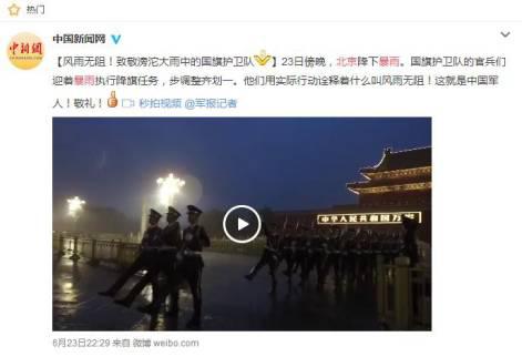 暴雨中的国旗护卫队,大雨滂沱,不改军人本色。