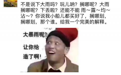 "明天是否需要租船上班?去哪里租?""明天上班水路拥挤,我还是租雨衣雨鞋吧"。另有机智网友调侃可以在暴雨期间做生意了:出租救生圈及泳衣,50元一套、共享鸭子船,50元扫码开划。对于这场约好的大雨,网友们纷纷脑洞大开。