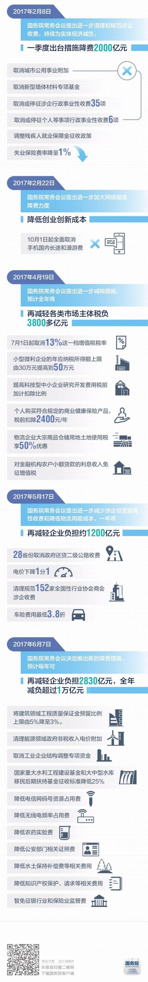 "全年为企业减税降费力争达到1万亿元。"今年3月份的两会记者会上,李克强总理掷地有声作出承诺。上半年以来,总理已经先后5次在国务院常务会部署减税降费工作,每一次都有实实在在减税降费实招:取消手机国内长途和漫游费、小微企业年应纳税所得额上限由30万元提高到50万元……在这说不完了,中国政府网(微信ID:zhengfu)、国务院客户端已经帮你整理好,一图领取上半年减税降费福利吧。