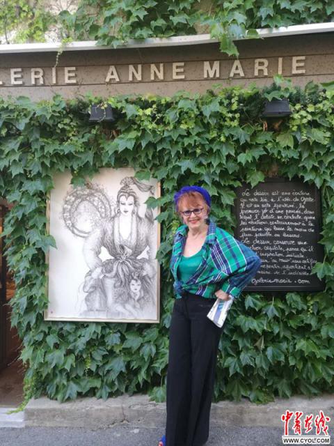 穆然一家画廊的女画家见到中国记者十分开心,在她的画作前摆出各种"POSE"让记者拍照。摄影:吴勋高鑫诚