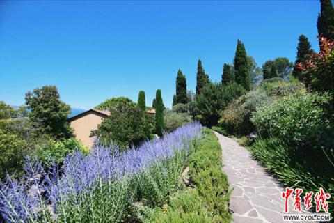 从尼斯机场驱车20多分钟,记者一行入住的第一家酒店卡蒂勒酒店(LeMasCandille),就非常惊艳。从大门进入,占地4公顷多的酒店区域里,到处都是灰白颜色的橄榄树、一簇一簇的薰衣草和成片的叫不上名字的各色花草。从客房窗户北望,近在眼前的那片绿树掩映中似城似村、如诗如画的地方,就是著名的"香水之都"格拉斯。