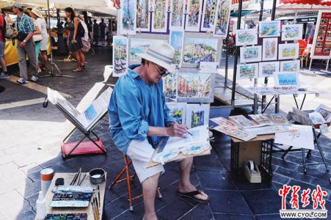 尼斯市场入口处专心作画的自由艺术家。在"蔚蓝海岸"的一些大小城市,市场不仅是购买日用品、二手艺术品的场所,更成为游客们的观光景点。摄影:吴勋高鑫诚
