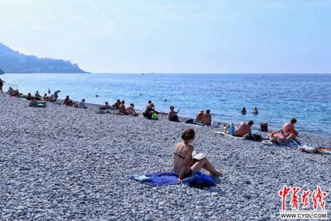 尼斯天使湾海边休闲的人们。鹅卵石海滩让记者觉得很新鲜。摄影:吴勋高鑫诚