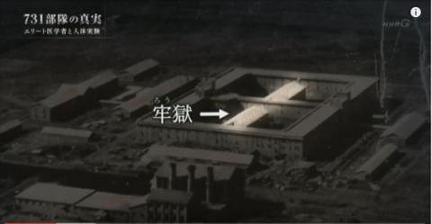 解说员:这是("731部队"总部)当时的照片。部队在方圆数公里的广阔营地中,极其秘密地实施着研究。在四方形的三层大楼里,并排着的是装备有制冷制暖设备的最先进的研究室。大楼中央设置有从周围无法看见的牢狱,用来关押被用作试验材料的人们。