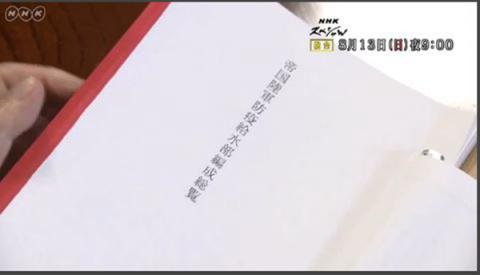 解说员:(这是)原"731部队"队员之一的须永鬼久太先生。他保管着一份宝贵的资料,是有关至今不为人知的医学者们参与("731部队"人体实验)全貌的线索,"731部队"的战友会在战后整理的名册(《帝国陆军防疫给水部编成总览》)。