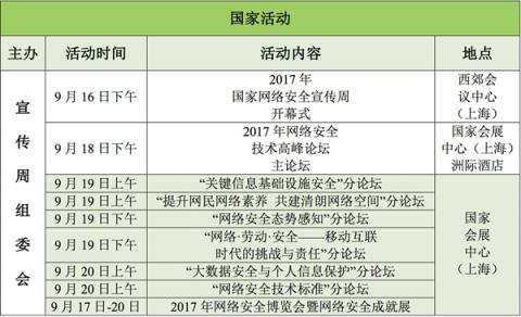 地点 全国范围内统一举行,其中开幕式、网络安全博览会暨网络安全成就展、网络安全技术高峰论坛、一流网络安全学院示范高校授牌、先进典型表彰等重要活动在上海市举办