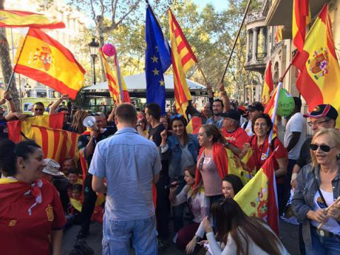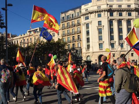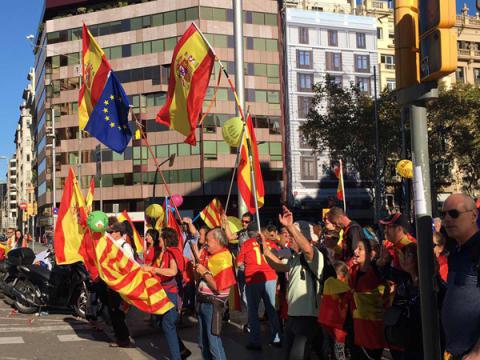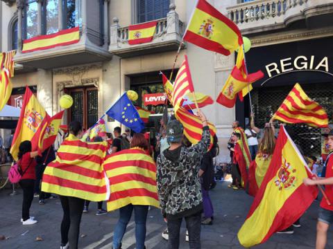 29日,巴塞罗那民众在加泰罗尼亚广场一带举行“反分裂”大型集会和游行活动。朱厚诚/摄