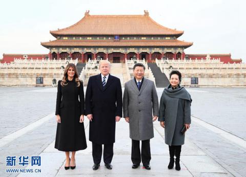 11月8日,国家主席习近平和夫人彭丽媛陪同来华进行国事访问的美国总统特朗普和夫人梅拉尼娅参观故宫博物院。这是两国元首夫妇在太和殿广场合影。新华社记者 谢环驰 摄