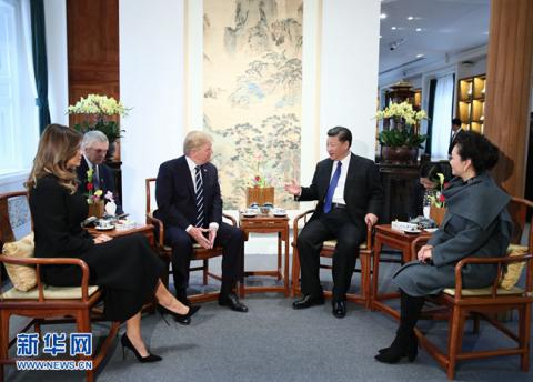 11月8日下午,国家主席习近平和夫人彭丽媛在北京故宫博物院迎接来华进行国事访问的美国总统特朗普和夫人梅拉尼娅。两国元首夫妇在宝蕴楼简短茶叙。新华社记者 兰红光 摄