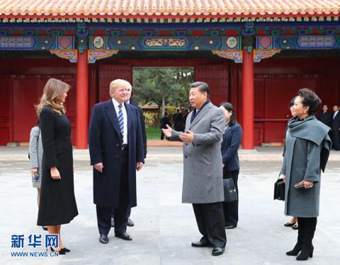 11月8日下午,国家主席习近平和夫人彭丽媛在北京故宫博物院迎接来华进行国事访问的美国总统特朗普和夫人梅拉尼娅。新华社记者 谢环驰摄