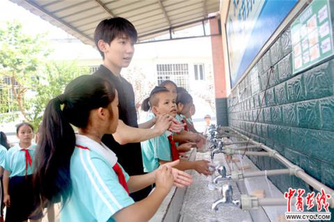 今年9月,王源在“爱生学校”里带领学生在餐前用肥皂洗手。
