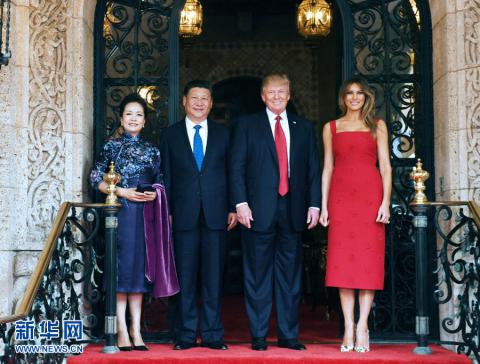 2017年4月6日,习近平在美国佛罗里达州海湖庄园同美国总统特朗普举行中美元首会晤。这是习近平和夫人彭丽媛同特朗普和夫人梅拉尼娅合影留念。新华社记者 饶爱民 摄