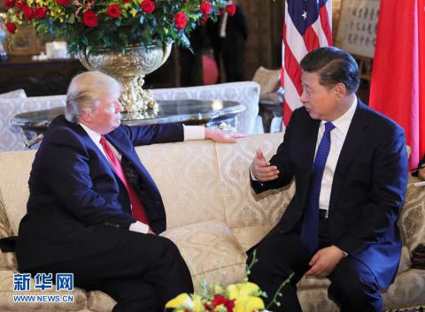 2017年4月6日,习近平在美国佛罗里达州海湖庄园同美国总统特朗普举行中美元首会晤。 新华社记者 兰红光 摄