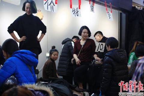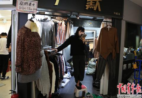 11月29日,东鼎市场,导购员丽丽站在小板凳上。导购员有时需要试穿售卖的服装,向顾客展示。中国青年报·中青在线记者赵迪/摄