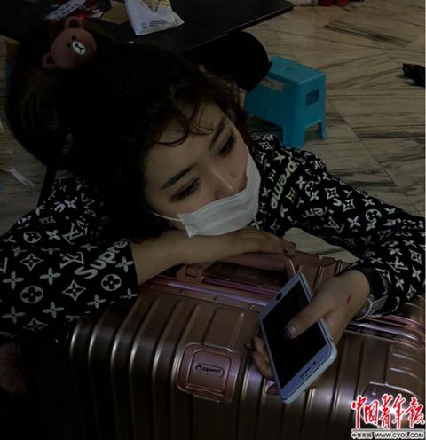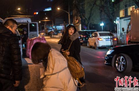 11月29日晚,东鼎市场对面,来自黑龙江省七台河市的赵女士准备和同去燕郊东贸国际服装城的商户一起离开。中国青年报·中青在线记者王婷舒/摄