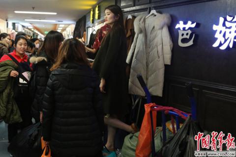 11月29日是东鼎市场营业的最后一个夜晚。关门时间过后,扫尾货的顾客仍在不断涌进月月工作的服装店。“毛衣都是纯羊毛的,30元甩了啊”,这个28岁的东北姑娘站在木台子上,边吆喝边把店里最后一件羽绒服从模特身上脱下递给顾客。