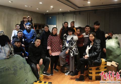 11月29日,“动批”的最后一夜,北京市动物园区域东鼎批发市场一家经营十多年的服装店里,店员们合影留念。他们来自全国各地,年龄最大的32岁,最小的21岁。当晚他们就要离开北京前往天津王兰庄,在那里的店铺开始新生活。中国青年报·中青在线记者赵迪/摄