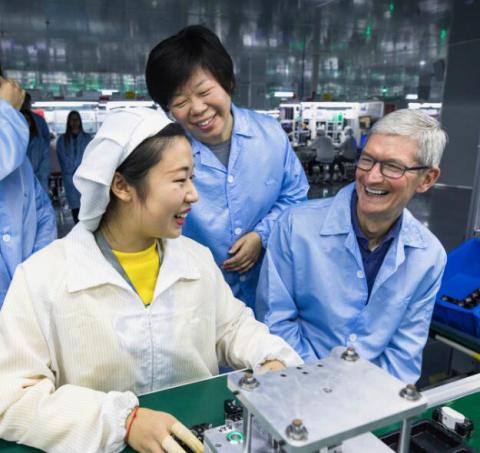 图为苹果公司首席执行官蒂姆 库克(右一)参观中国供应商。苹果766家零组件供应商,光中国就揽了346家。