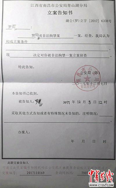 “经查,我局认为构成立案条件,现决定对你非法拘禁一案立案侦查。”小罗给记者提供了一份《立案告知书》中显示,落款南昌市公安局青山湖分局,时间为12月7日。