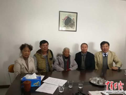 21日下午,来京递交外交保护申请书的原日军“慰安妇”陈连村老人与记者见面。左起依次为康健律师、陈厚志志愿者、陈连村老人、苏智良教授、管建强教授。张蕾摄