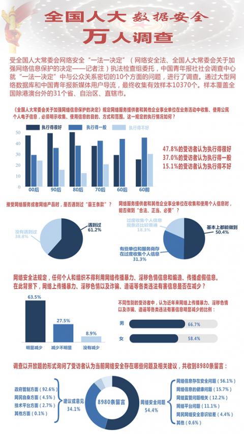 近日,受全国人大常委会网络安全“一法一决定”(网络安全法、《全国人大常委会关于加强网络信息保护的决定》——编者注)执法检查组委托,由中国青年报社社会调查中心负责执行的“全国人大数据安全万人调查”结果出炉。