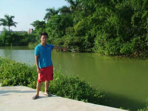 2011年,庞华新在救人时的水塘旁留影。受访者提供