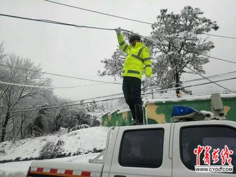 江苏句容95后辅警寒风中托举电缆半小时