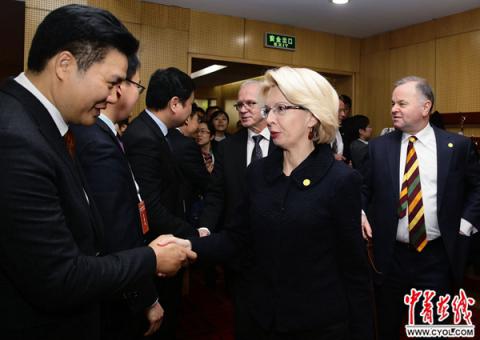 1月10日,北欧和波罗的海国家议长与中国青年企业家对话会在北京举行。会前,拉脱维亚议长伊娜拉▪穆尔涅采等北欧和波罗的海国家议长与中国青年企业家代表握手问候。中国青年报·中青在线记者 陈剑/摄