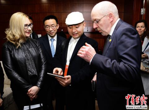1月10日,北欧和波罗的海国家议长与中国青年企业家对话会在北京举行。会后,杭州林东新能源科技股份有限公司董事长林东(右二)给芬兰议长玛丽亚▪洛赫拉(左一)、冰岛议长斯泰因格里姆尔▪西格富松(右一)介绍海浪发电。中国青年报·中青在线记者 陈剑/摄