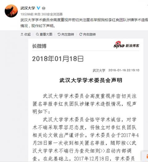 武汉大学称,该校学术委员会于2017年4月28日第一次收到相关匿名举报,随即按《武汉大学学术不端行为查处细则》启动内部调查。