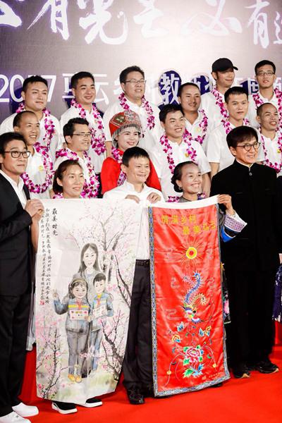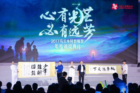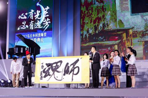 颁奖典礼前的走红毯仪式上,马云和每位老师握手,他们都叫他“马老师”。马云拿着奖状、锦旗、英雄带和乡村老师们写给他的信,红着眼睛,却笑得像个孩子。