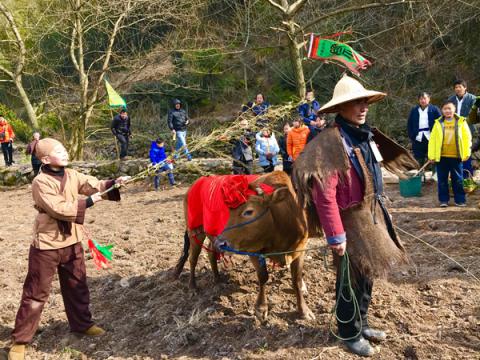 儿童扮演牧童,唱着《鞭春喝彩歌谣》,鞭打“春牛”耕作。鞭春牛是九华“立春祭”一个重头戏,是对农耕文化的再现。