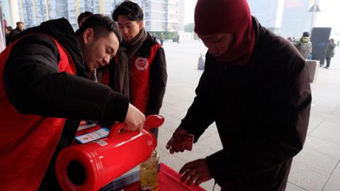 在宁波火车站南广场一楼进站大厅门口,几张宣传海报、桌椅、七八位志愿者,就构成春运志愿者的“大本营”。一有旅客前来询问,穿着“红马甲”的95后大学生会立即起身,面带笑容、精神抖擞地提供引导咨询、热水供应、重点旅客帮扶、宣传资料分发等各类服务。