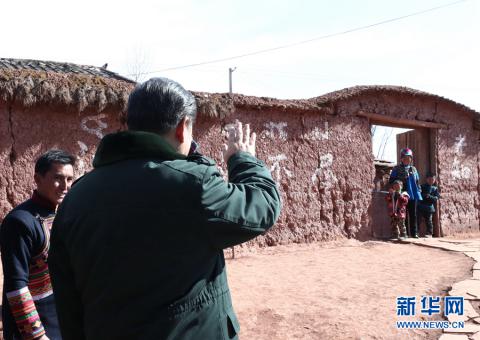 中华民族传统节日农历春节来临之际,中共中央总书记、国家主席、中央军委主席习近平来到四川考察调研,看望慰问各族干部群众,向全国各族人民致以美好的新春祝福。这是2月11日上午,习近平在凉山彝族自治州昭觉县三岔河乡三河村考察时同村民打招呼。新华社记者 鞠鹏 摄
