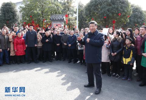 中华民族传统节日农历春节来临之际,中共中央总书记、国家主席、中央军委主席习近平来到四川考察调研,看望慰问各族干部群众,向全国各族人民致以美好的新春祝福。这是2月12日上午,习近平在成都市郫都区战旗村考察时向群众拜年,祝愿全国各族人民新春快乐、阖家幸福。新华社记者 鞠鹏 摄