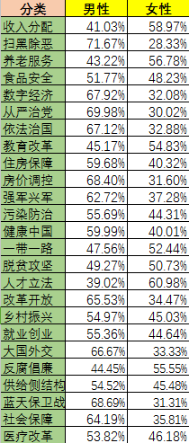 通过对男性用户及女性用户所关注的话题类别进一步分析发现,男性用户更为关注的话题有扫黑除恶、从严治党、蓝天保卫战等,女性用户更为关注的话题则是人才立法、收入分配等。