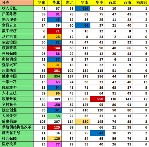 在25个话题讨论中,华东、华北、东北、港澳台地区的网民最关注的话题为健康中国;华南地区的网民最关注的话题为反腐倡廉;华中、西北、西南地区的网民最关注的话题为改革开放。