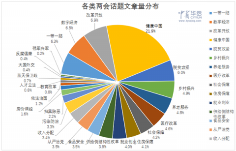 通过分析从新浪微博平台随机抽取的12859条各类两会话题文章,中青舆情监测室发现,网民关注点主要覆盖健康中国、改革开放、数字经济、“一带一路”、脱贫攻坚等25个领域。其中,以健康中国为代表的环保健康类话题,成为两会前夕备受关注的热点话题,约占样本总容量的四分之一。其次是改革开放(6.9%)和数字经济(6.5%)。