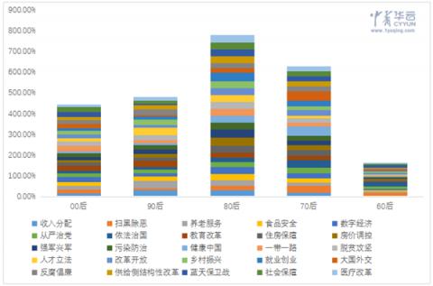 70后最关注的话题为大国外交、健康中国、依法治国;80后作为参与两会话题的主力军,最关注的话题为就业创业、房价调控、强军兴军;90后最关注的话题为养老服务、人才立法、收入分配。