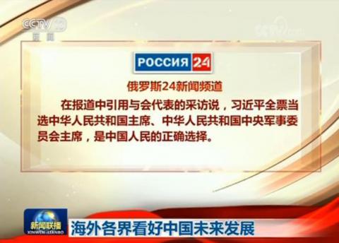 俄罗斯24新闻频道在报道中引用与会代表的采访说,习近平全票当选中华人民共和国主席、中华人民共和国中央军事委员会主席,是中国人民的正确选择。
