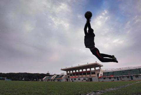 1月11日,呼和浩特市玉泉区通顺街小学小球员在冬令营进行头球练习。本版图片均由视觉中国供图